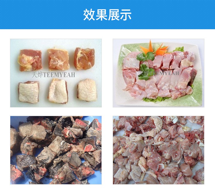 適用于-5—0℃的冷凍排骨切塊、凍五花肉、凍半片鴨半片雞切塊產(chǎn)品一次成型。